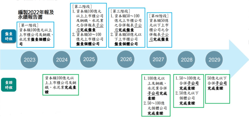我國政府已由鼓勵上巿櫃公司率先「編制永續報告書」及「碳盤查與完成查證」等,並設定推動里程碑,一則為我國連結國際趨勢及全球經貿要求進行必要之政策引導外,二則由上巿櫃公司擔任各產業推動ESG領頭羊之工作,以客戶、中心廠的角色,串起供應鏈上、下游的擴大推動,帶起我國產業永續發展轉型的契機。