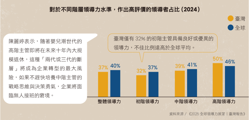 她分析,臺灣高階領導者雖因經驗豐厚表現突出,但中、基層主管的領導力評價卻出現「斷崖式下跌」。這是因為臺灣企業習慣「事必躬親」的一代創業家或老臣,長期將中階主管培養成聽令行事的「猛將」,而非具備運籌帷幄能力的「帥才」。