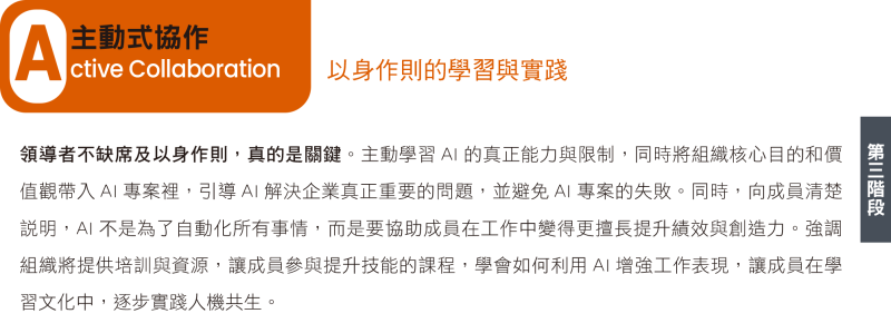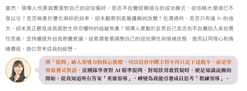 領導者不能缺席導入AI應用的關鍵階段,唯有具備商業全局視角,才能提出以組織目的為核心的適切提問,以導入AI解決組織真正重要的議題。