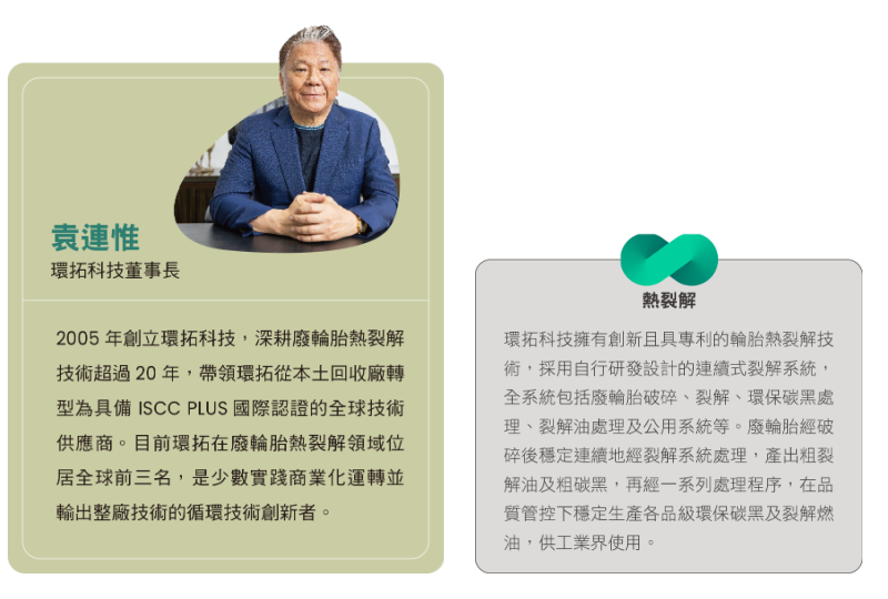 「我們不應再將供應鏈視為一條通往垃圾場的單行道」袁連惟在CPC出版之《循環供應鏈》一書推薦序中指出,真正的轉型在於「重新設計物流系統」。環拓在臺灣建立起覆蓋全臺的回收網絡,確保每一條廢輪胎都能進入循環體系,還原為環保碳黑(rCB)、裂解油與鋼絲,實踐「從搖籃到搖籃」。