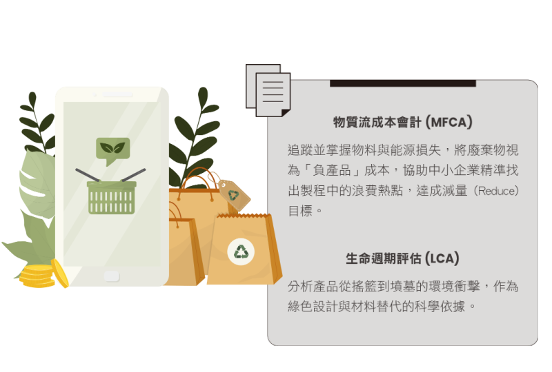 在推動全面經營管理的提升上, 企業可引導供應商導入綠色生產力(GP) 管理工具,如「物質流成本會計」(MFCA) 與「生命週期評估」(LCA)。透過這些工具,減碳不再只是增加成本,而是精確提升資源使用效率與獲利能力的有效方法。